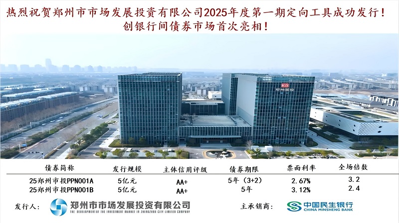 近日,鄭州市市場發(fā)展投資有限公司(以下簡稱“鄭州市投”,外部主體評(píng)級(jí)AA+)成功發(fā)行2025年度第一期定向債務(wù)融資工具,進(jìn)一步優(yōu)化了公司融資結(jié)構(gòu)。本期債券由民生銀行擔(dān)任主承銷商,發(fā)行總規(guī)模10億元,創(chuàng)新采用“3+2年”(票面利率2.67%)與“5年”(票面利率3.12%)雙期限結(jié)構(gòu),創(chuàng)下近期同期限、同評(píng)級(jí)企業(yè)信用債首發(fā)利率較低水平,顯示出資本市場對鄭州國企發(fā)展前景的高度認(rèn)可。